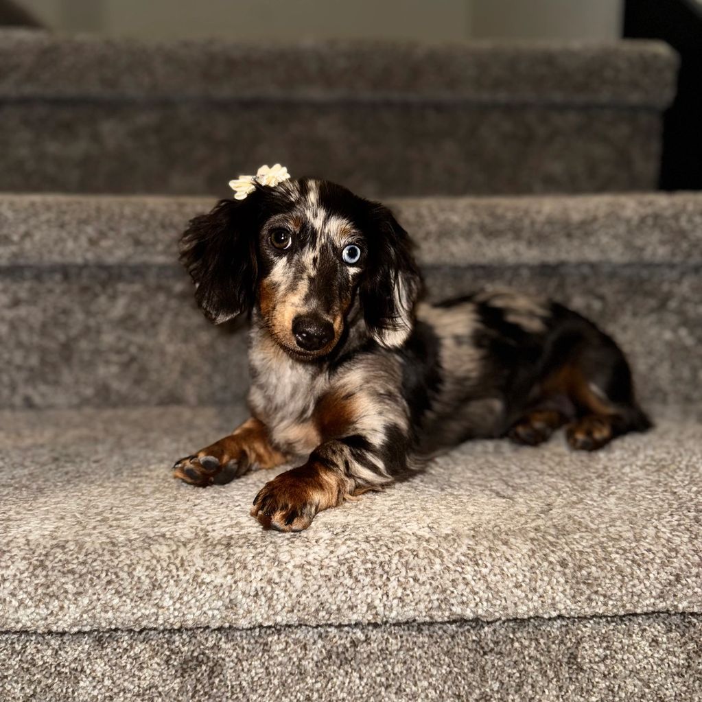2026. She is a long haired ee cream piebald, hidden dapple Miniature Dachshund. AKC