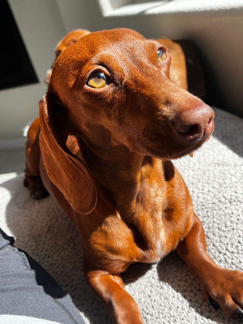 🐾Kora is one of our Dams. Genetically health tested and Merle clear. She is a red, short-haired Miniature Dachshund and is AKC Registered. Kora is shy and VERY loving. She and Peanut are best friends. Weight: 9 pounds🐾